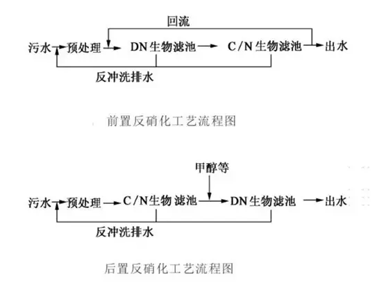 后置反硝化是废水首先经过硝化滤池或滤池的好氧段,出水进入DN滤池或滤池的DN段,后置脱氮技术不利的一面是需要外加碳源,运行成本相对较高,同时如何投加适当剂量的碳,需要可靠的控制和稳定的进水浓度,同时出水需要进行曝气去除过量的碳。典型反硝化流程: